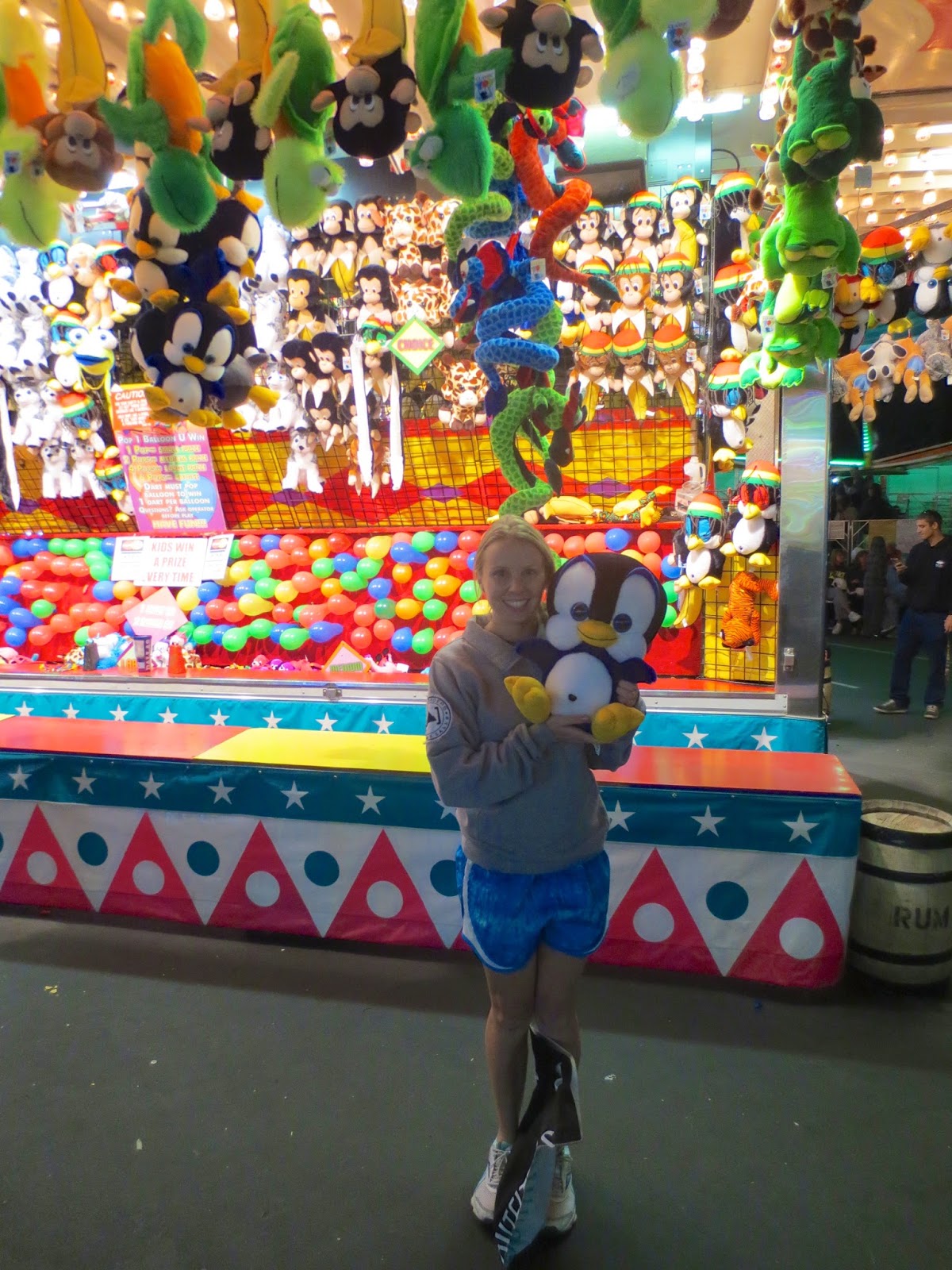 Even though all the games are totally fixed and a waste of money, I wanted to play some anyway and feel like I was a little kid. The one that Brett & I did the best at was throwing darts and popping the balloons. You needed to pop 6 balloons to get a big stuffed animal and I had my eye on a certain penguin. With little effort we popped all 6 and the penguin was mine!